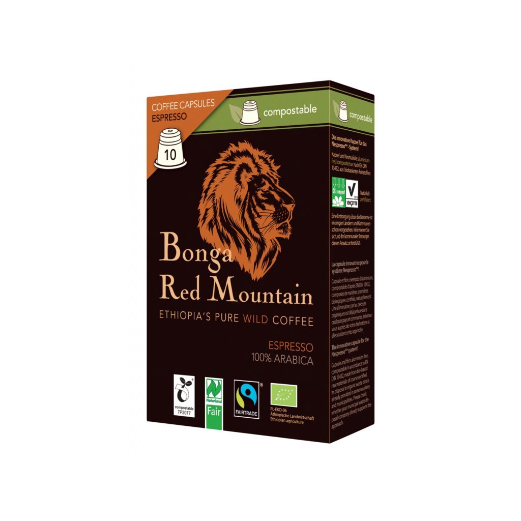Pôvod kávy je v posledných horských dažďových pralesoch Etiópie. Miestni farmári ručne a starostlivo zbierajú plody kávy do košov. Sušia ich na slnku a jednu po druhej čistia. Tradičné dlhotrvajúce praženie kávových zŕn robí Bonga Red Mountain jednou z najlepších káv na svete. Bonga Red Mountain je káva s pôvodom - 100% Arabica.